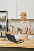 Młoda kobieta robi muesli na śniadanie przy stole kuchennym
