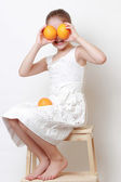 Zabawna dziewczyna siedzi na podłodze z pomarańczy. na białym tle