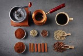 Grupa misek różnej wielkości z olejkami eterycznymi, ziarnami kawy, suchymi kwiatami i innymi składnikami do wytwarzania naturalnych produktów kosmetycznych