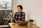 Młoda blondynka pijąca ze szkła, siedząca przy stole w kuchni