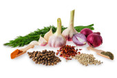 czosnek, sucha papryka chili, pietruszka, zielona czarno-biała papryka i kolendra izolowane na białym tle