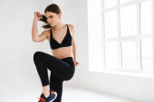 Sportowa młoda sportowiec w słuchawkach ćwiczy w pomieszczeniach