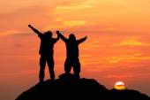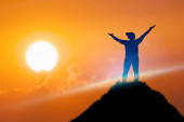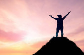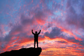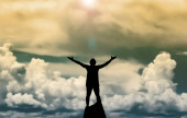 sylwetka człowieka stojącego na skale z podniesionymi rękami i zachmurzonym niebem na tle
