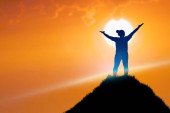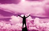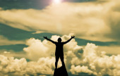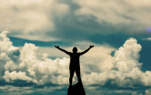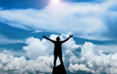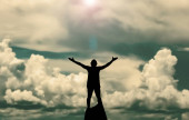 sylwetka człowieka stojącego na skale z podniesionymi rękami i zachmurzonym niebem na tle
