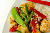 Kurczak Jambalaya, gotowane kawałki piersi kurczaka, w przyprawionym sosie pomidorowym z chorizo, ryż pełnoziarnisty, szpinak dla niemowląt, pokrojona w kostkę dynia i pokrojona w plasterki czerwona papryka, kuchnia kreolska