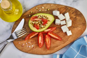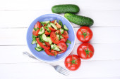 Miska z posiekanymi pomidorami i ogórkami przyprawionymi cytryną