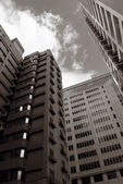 Widok fasady nowego wielopiętrowego domu mieszkalnego. Słoneczny dzień. Czarno-biały obraz.Koncepcja tła budynku