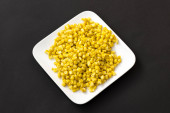 Surowy żółty proso w przezroczystej szklanej płytce na białym tle. Widok z góry.