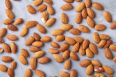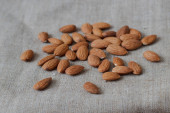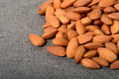 Surowe orzechy migdałowe stos na jasnym tle papieru.