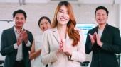 Grupa trzech azjatyckich biznesmen i kobieta poufne stojąc i dając kciuki do kamery, businesswoman trzyma cyfrowy tablet, biznesmeni w centrum miasta.