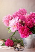 Kosz ładny różowy piwonie, białym tle rustykalnym, kopia spa