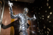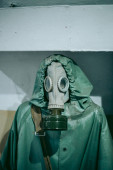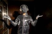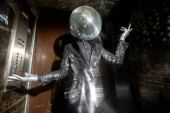 mężczyzna z musującą maską gazową tańczący w windzie