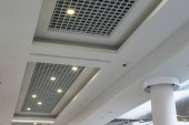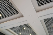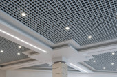 sufit podwieszany i siatkowy z lampami halogenowymi i konstrukcją płyt gipsowych w pustym pomieszczeniu w magazynie lub domu. Sufit napinany biały i skomplikowany kształt.