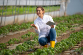 Zdjęcie "Kobieta rolnik stojąca w szklarni, sprawdzająca postępy w produkcji pomidorów. Inżynier wykorzystujący nowoczesną technologię tabletów w produkcji żywności. " może być wykorzystywane do celów osobistych i komercyjnych zgodnie z warunkami zakupionej licencji Royalty-free. Obraz jest dostępny do pobrania w jakości wysokiej rozdzielczości do 5760x3840.