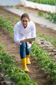 Kobieta rolnik stojąca w szklarni, sprawdzająca postępy w produkcji pomidorów. Inżynier wykorzystujący nowoczesną technologię tabletów w produkcji żywności.