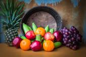 egzotyczne owoce w metalowej misce i drewniane pudełko w pobliżu koc ozdobny na pomarańczowy