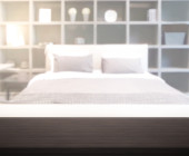 Drewniany stolik nocny z dwiema szufladami obok wygodnego łóżka z drewnianą ramą i zagłówkiem w prostej sypialni