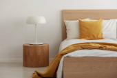 Zdjęcie "Drewniany stolik nocny z dwiema szufladami obok wygodnego łóżka z drewnianą ramą i zagłówkiem w prostej sypialni" może być wykorzystywane do celów osobistych i komercyjnych zgodnie z warunkami zakupionej licencji Royalty-free. Obraz jest dostępny do pobrania w jakości wysokiej rozdzielczości do 5760x3840.