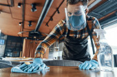 Młodzi kelnerzy w ochronnych stołach do czyszczenia odzieży roboczej w restauracji