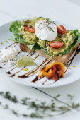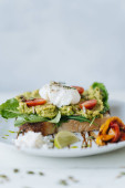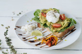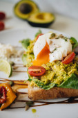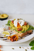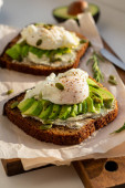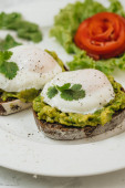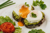 Poached eggs with avocado on sourdough toasts on white background. TSide view