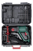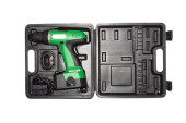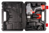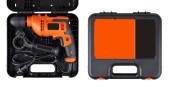 Wiertarka elektryczna w walizce na białym tle. Bezkluczykowy Chuck. Zęby zębate. Narzędzie zbliżeniowe. Metalowe szczegóły. Mechanika i narzędzia pracy.