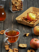 Pyszny kompot z suszonymi owocami w szklanym dzbanku na jasnodrewnianym stole, miejsce na tekst
