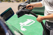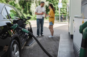 młoda kobieta trzymająca pistolet benzynowy w pobliżu samochodu na stacji benzynowej