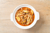 Koreański makaron udon ramen z wieprzowiną w zupie kimchi - azjatycki styl żywności