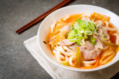 Koreański makaron udon ramen z wieprzowiną w zupie kimchi - azjatycki styl żywności