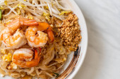 smażony makaron z krewetkami i kiełkami lub Pad Thai - azjatycki styl żywności