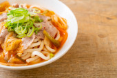 Koreański makaron udon ramen z wieprzowiną w zupie kimchi - azjatycki styl żywności