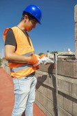 Zdjęcie "Elektryk nagrywa i przesyła proces instalacji w fabryce w telefonie komórkowym. " może być wykorzystywane do celów osobistych i komercyjnych zgodnie z warunkami zakupionej licencji Royalty-free. Obraz jest dostępny do pobrania w jakości wysokiej rozdzielczości do 5760x3840.