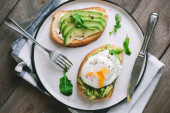 Kanapka z awokado z jajkiem na czarnym talerzu na drewnianym stole