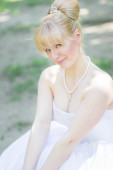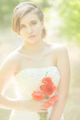 portret pięknej młodej w przyrodzie. młoda kobieta trzyma mały bukiet białych róż w swoje ręce