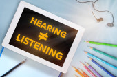 Słuchanie to nie to samo, co odsłuch napisany na niebieskiej łamigłówce odizolowanej na żółtym tle. Koncepcja kierownictwa biznesu i praca zespołowa na rzecz idei komunikacji