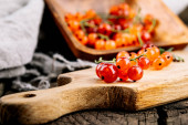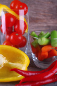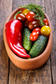 Miska marynowanych warzyw na drewnianym stole. Ogórki