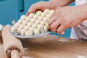 Uśmiechnięty facet ugniata ciasto w domu. Koncepcja pieczenia. Przestrzeń kopiowania.