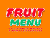 Zdjęcie "Logo wektorowe owocowy napój. Kolorowe czcionki. Modny zestaw liter i liczb alfabetu" może być wykorzystywane do celów osobistych i komercyjnych zgodnie z warunkami zakupionej licencji Royalty-free. Obraz jest dostępny do pobrania w jakości wysokiej rozdzielczości do 5760x3840.