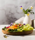 Letnia sałatka warzywna z awokado, sezonowe warzywa, szpinak i mikro-zielenina na drewnianym białym tle.