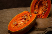 Zdjęcie "Pumpkin slices with seeds on darl background. Top view" może być wykorzystywane do celów osobistych i komercyjnych zgodnie z warunkami zakupionej licencji Royalty-free. Obraz jest dostępny do pobrania w jakości wysokiej rozdzielczości do 5760x3840.