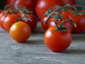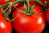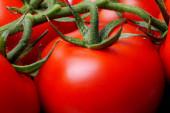 zbliżenie dojrzałych pomidorów na winorośli pokrytych kroplami wody