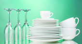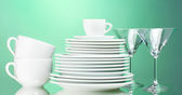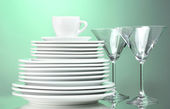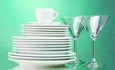 Zestaw czystych zastaw stołowych na jasnozielonym tle