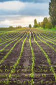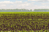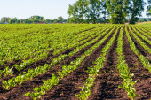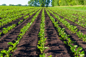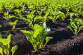 Proste rzędy buraków cukrowych w perspektywie na polu rolniczym. Uprawa buraków cukrowych.