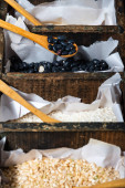 Zielona plastikowa łyżka do pomiaru wody z porcją surowej soczewicy
