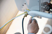 Zdjęcie "Człowiek instaluje kompresor ścienny klimatyzatora w sezonie gorącym" może być wykorzystywane do celów osobistych i komercyjnych zgodnie z warunkami zakupionej licencji Royalty-free. Obraz jest dostępny do pobrania w jakości wysokiej rozdzielczości do 5760x3840.