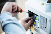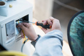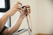Człowiek instaluje kompresor ścienny klimatyzatora w sezonie gorącym
