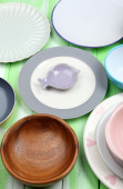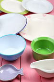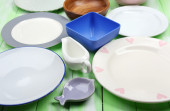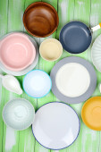różne naczynia na drewniane tła