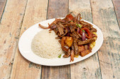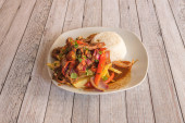 Peruwiański przepis na Lomo Saltado z frytkami, białym ryżem, czerwonym i zielonym pieprzem Twisty, cebula i pietruszka na białym talerzu