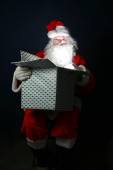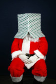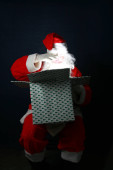 Świąteczna skarpeta. Święty Mikołaj wypełnia świąteczne pończochy prezentami i smakołykami. Wesołych Świąt. Wesołych Świąt.
