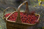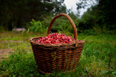 Świeże żurawiny w koszyku na mchu na zielonym tle natury